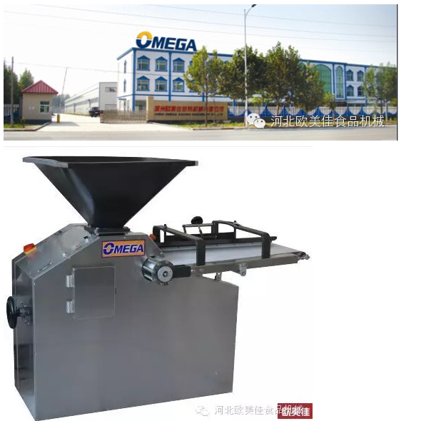 此機有一個裝面團的漏斗,可裝40Kg之面團,攪拌之后面團直接放入此漏斗中,漏斗下有一滾筒,滾筒內(nèi)有活塞,活塞往下走時,靠吸力把面團吸入活塞中,滾筒往右轉(zhuǎn)動,活塞往上走,把分割好的小面團吐出到輸送帶上,經(jīng)過滾圓軌道把面團滾圓,完成分割滾圓的工作。